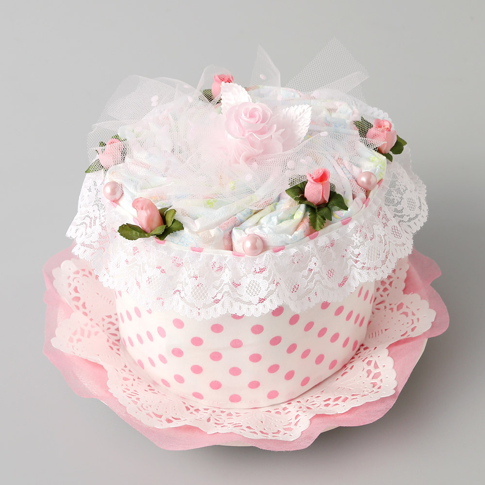 今時の出産祝いの定番中の定番となったおむつケーキです。 高島屋のおむつケーキはバラの花とレースを配したシンプルで上品なもの。 そのまま飾っておきたくなる可愛さです。