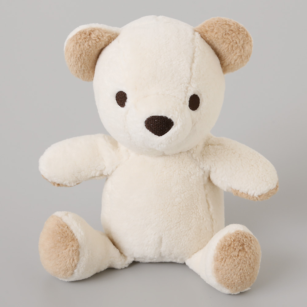 オーガニックコットンを使用した日本製のぬいぐるみです。 染色もされていないので、自然そのままの色味と風合い。 目と鼻も後から取り付けたものではなく、刺繍をほどこした仕様で、赤ちゃんが取り外して口にいれたりする心配もありません。