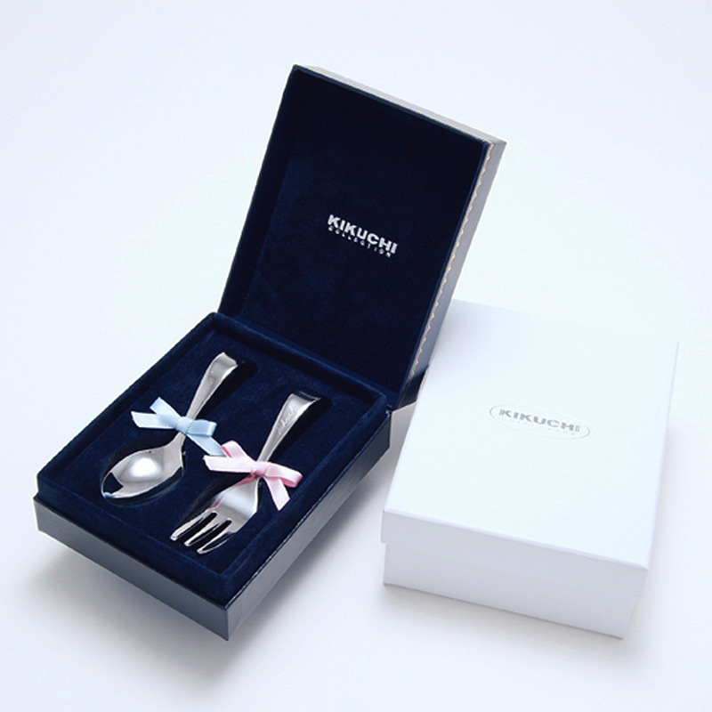 刃物造りの老舗「菊藤」のスプーンとフォークのセットです。 ステンレス製なのでとても丈夫な造り。 名前や生年月日、生まれた時の体重なども入れてもらうことができるので、記念品としても人気です。