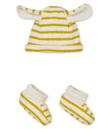 うあわらかくなめらかな肌触りのベビーキャップとシューズのセットです。 赤ちゃんの頭にやさしくフィットするキャップは大切な頭を守ってくれます。 可愛いシューズが足元にあれば、とってもおしゃれに見えますね! 専用ボックスに入っているので、出産祝いに便利ですよ。