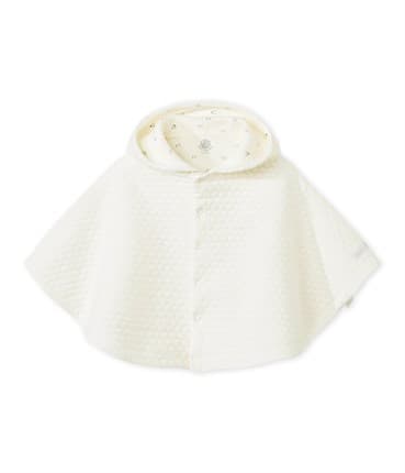 チュビック素材をキルティングにしたベビーケープです。 まるいジャガード柄とウサギのプリント柄がリバーシブルで使えます。 おでかけににも、おくるみにも、用途はたくさん。 中綿もふさふさで赤ちゃんを包みこんでくれる、出産祝いのギフトにお勧めの商品です。