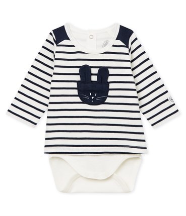 トップスのようなおしゃれなデザインのリブ編みコンビボディーアウターです。 マリニエールボーダーにうさぎの顔をフロントにプリントしたキュートな1品です。 かわいいボトムスを合わせれば、素敵なコーディネートの完成です!