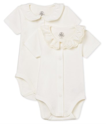 リブ編み半袖ボディのデイウェアは、前開きなので新生児には安心です。 かわいいフリルの付いたデザインはブラウスのようですね! 生後間もない赤ちゃんに、出産祝いで贈ってみてはいかがですか。