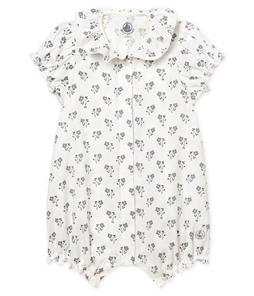 やわらかなコットンポプリン素材のショートロンパースです。 フラワープリントと可愛いフリルが女の子らしさを強調してくれます。 便利なロンパースを出産祝い贈れば、きっと喜んでくれますね!