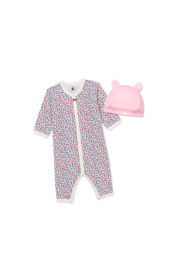 耳付きのディティールが可愛いキャップと花柄プリントのロンパースを合わせたセットです! それぞれでも使えるアイテムで、合わせ方もいろんなバリエーションがありますね。 かわいいギフトセットを贈ってあげてください。