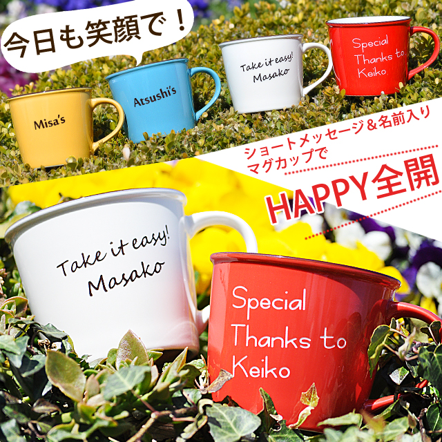 贈りたいメッセージはもう頭に浮かんでいますか? マグやコップはみんなに愛される定番のメッセージ入りプレゼントです。 相手の好み、自分の伝えたい気持ちにマッチするマグやコップを選び、更に喜んでもらいましょう!