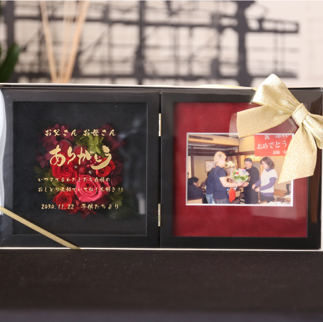 美しいプリザーブドフラワーがオリジナルの写真立てとしてプレゼントできます。 メッセージは自由に選べるため、どんなお祝い事にも対応可能! また、とってもおきの写真を入れてプレゼントすることで、思い出の詰まった贈り物となります。 特別な記念日にぴったりの豪華さと華やかさです。
