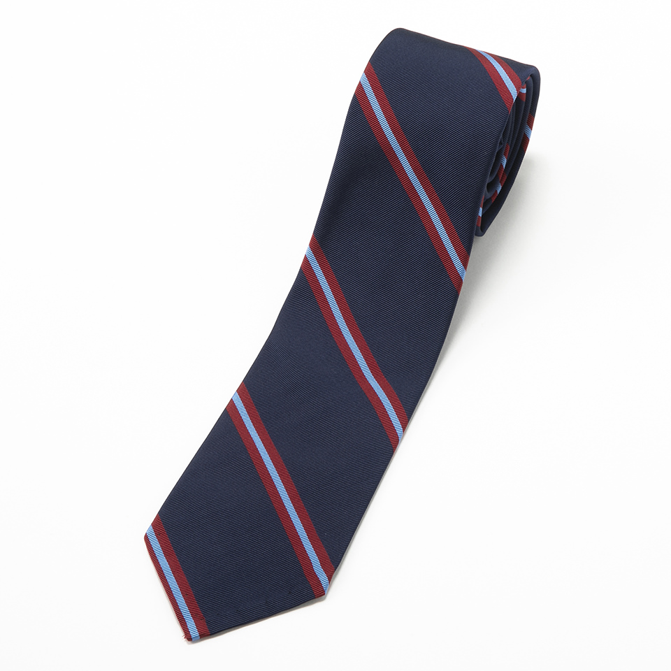 経糸にコットン・緯糸にシルクが使われていて、厚みもあり光沢感もあるネクタイです。 ネイビーブルーを基調に、レッドとサックスブルーのストライプがアクセントになっています。 価格:10,000円(税抜)
