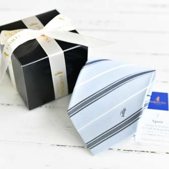 西陣織りの光沢感のあるシルク素材のネクタイです。 シンプルなストライプ柄なので、年代を問わずプレゼント出来ますよ。 おしゃれなギフトボックス入りで、ダークネイビーブルーとスカイブルーの2カラーから選べます。