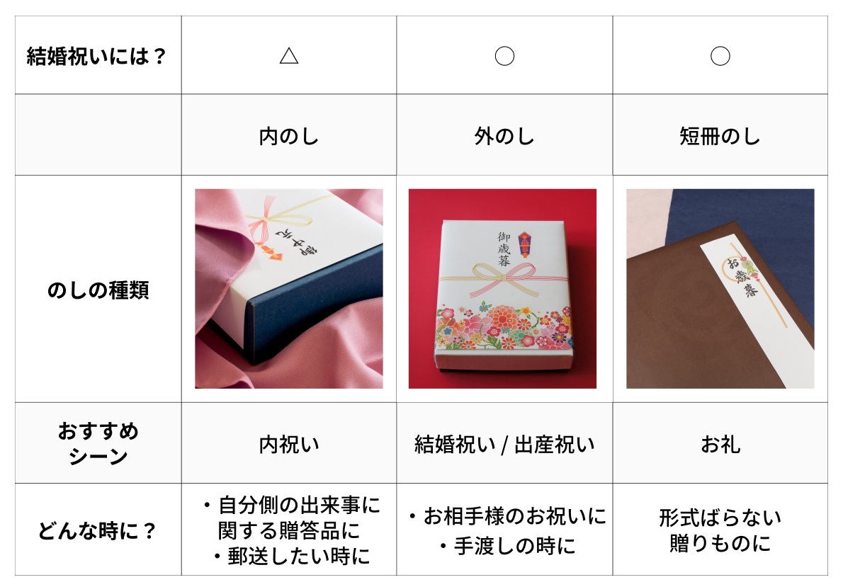 ギフトへの「のし」の掛け方は、直接手渡しする場合や持参する場合は「外のし」、宅急便などで配送する場合は「内のし」と使い分けます。 「内のし」は、包装紙を開けるまではどういった目的で贈られたか分からないのが特徴で、控えめに贈り物をしたい場合に用いられます。また配送中にのし紙が汚れてしまうことを避けるためにも、宅急便などでは「内のし」が選ばれやすいです。 一方「外のし」は、表書きが贈る相手にしっかりと見えるため、贈り物の目的が分かりやすいことが特徴です。そのためどのような目的で贈ったかがすぐに分かる「外のし」は特に結婚祝いや出産祝いに適しています。