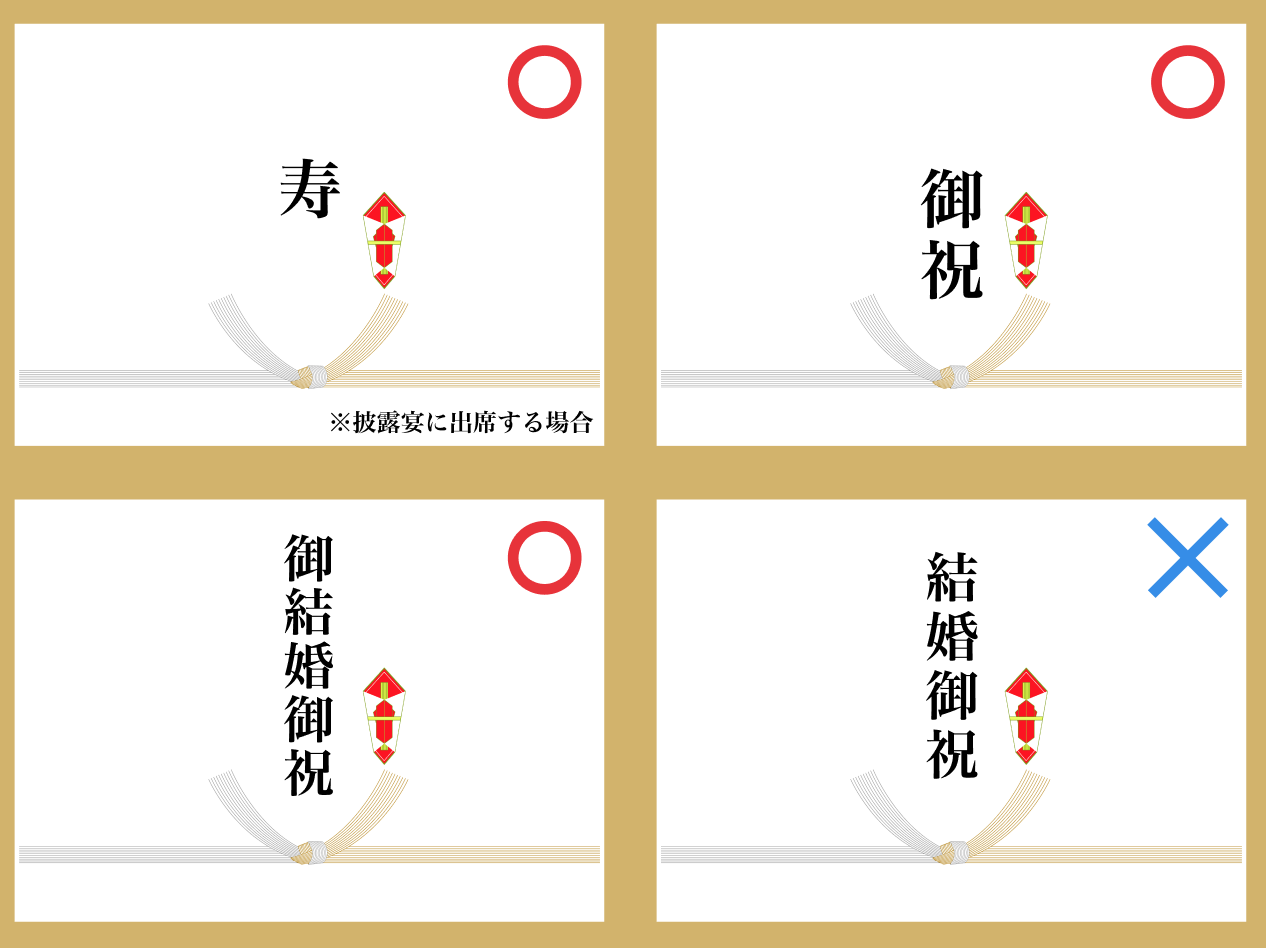 「表書き」とは、のし紙やご祝儀袋の中央上部に書く、贈り物の名目のこと。 結婚祝いの表書きには「御結婚御祝」や「寿」、「御祝」などと書きます。 この際、「御結婚祝」などの四文字は縁起が悪いとされているため避けるようにしましょう。 また、最近は表書きはすでに印刷されているものが多いですが、自分で書く場合は毛筆か筆ペンで書くのが正しいマナーです。お祝い事では濃い墨を使うようにしましょう。