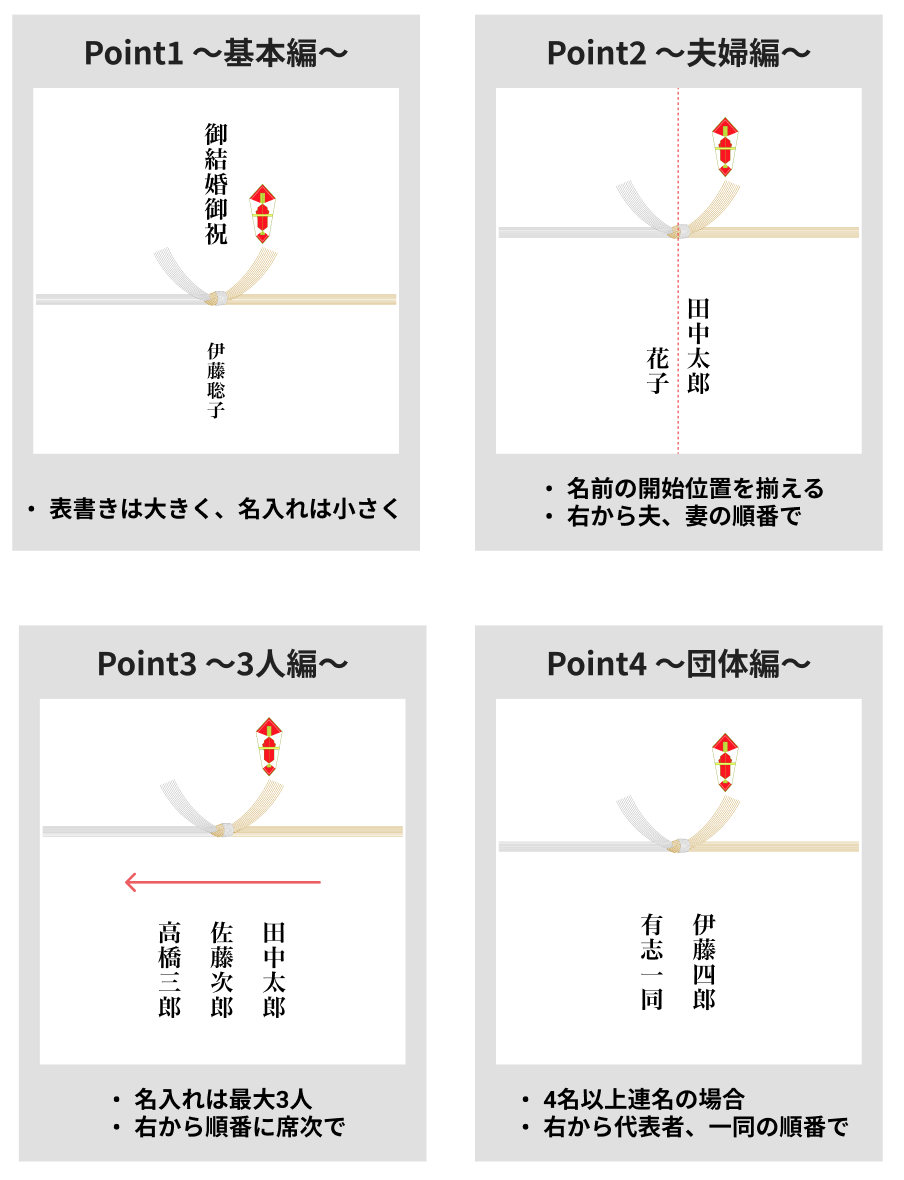 職場の連名で結婚祝いを贈る際、名入れの書き方には注意しましょう。 2名、3名で贈るときは、代表者(役職や年齢が上の方)の氏名を中央に書き、その左側に他の方の氏名を役職順や五十音順などで書きます。 4名以上で合同で贈る場合は、全員の氏名は表書きには書きません。代表者の氏名を中央に書いて、その左側に「外一同」と書くか、中央に「○○部一同」などと書きます。 その際、ご祝儀袋やギフトの箱の中などに、お祝いを出した方の氏名を書いた紙を入れておくのがマナーです。もし包んだ金額にバラつきがあれば、氏名を書いた紙に金額も記載しておきましょう。