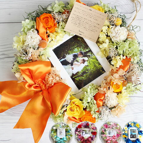 リースの中に写真が飾れるプリザーブドフラワーリースです。 リースのカラーも6色から選べますので、新居のイメージや花嫁の好きな色のリースが贈れます。 結婚式の思い出の写真を入れて飾れますので、お部屋一杯に幸せが広がるプリザーブドフラワーです。