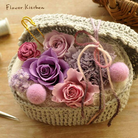 まるで手芸ボックスからお花が、溢れ出ているような可愛いデザインのプリザーブドフラワーです。 毛糸の温かみある素材と、プリザーブドフラワーが見事にマッチしています。 お部屋や玄関に飾ると、ぬくもりのある空間になると人気の贈り物です。