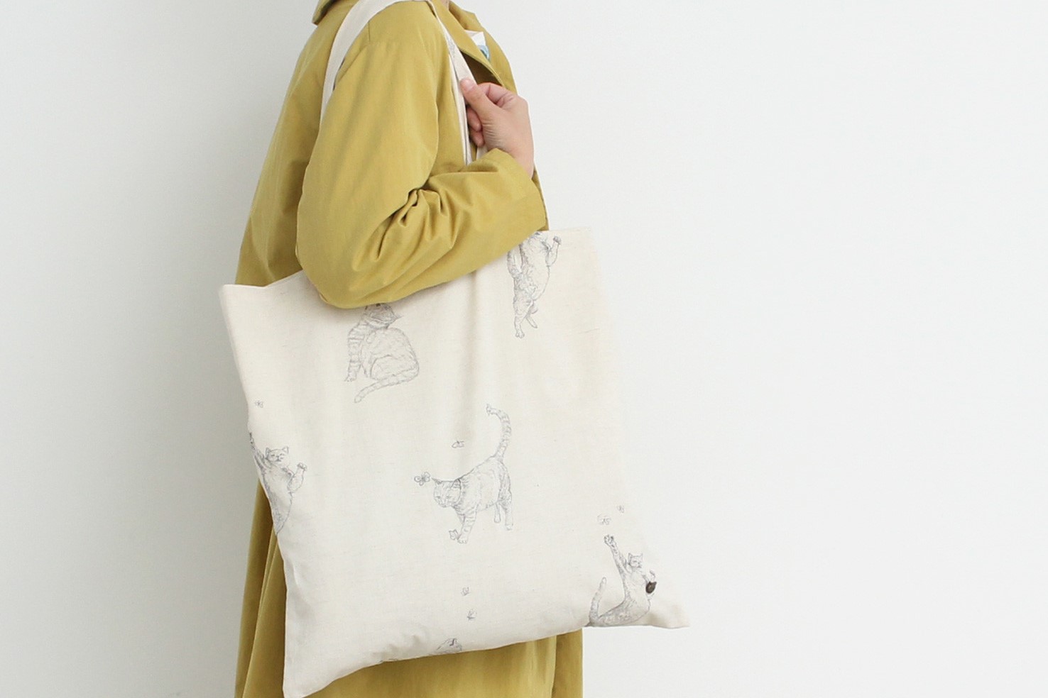 綿の素朴な風合いの「eiπe(イーペ)猫とちょうちょデッサンプリントトートバッグ」。 肩掛け出来て、裏にはポケット付きで、たくさんお買い物しても困らない大きさです。 普段使い出来るコットンのトートバッグは、いくつあっても嬉しいですね。