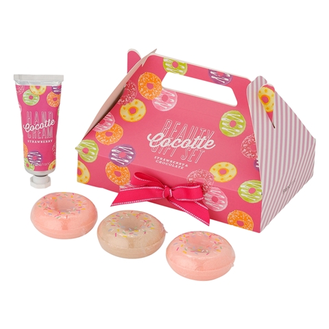 まるでドーナツみたいなバスフィズとハンドクリームがセットになって、ドーナツのBOXに入っているようなギフトセット。 かわいい!と女性に大人気。 女性への内祝いに贈ればきっと喜ばれます。