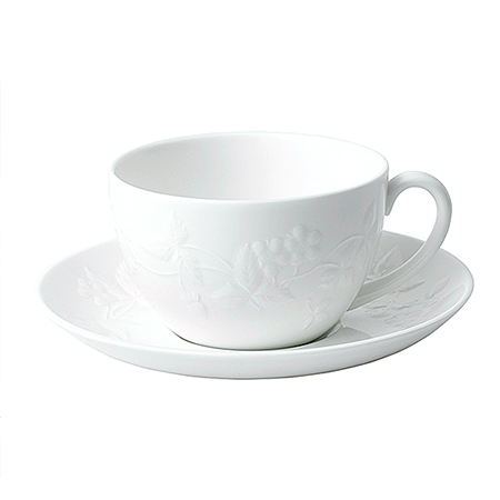ワイルドストロベリーの柄を浮き彫りにして表現した上品なティーカップセットです。 ホワイト一色で統一したシンプルなデザインは、どんなテーブルクロスにもマッチします。 上品なデザインで特別な時間を演出します。
