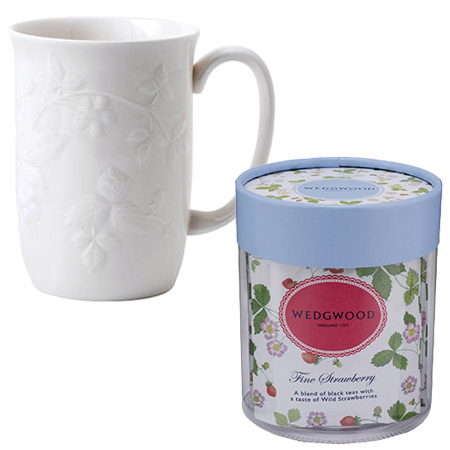 大人気のワイルドストロベリーの柄をエンボス模様で表現した上品なスタイルのマグカップです。 どんな食卓にも合って、さりげないかわいさを演出してくれます。 おすすめの紅茶もセットで贈れるので、幸せなティータイムを過ごしてもらえます。