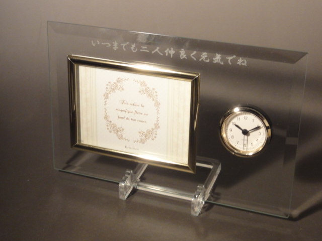 40代でも使いやすいとてもシンプルなフォトフレームに時計がついていて、名前やメッセージを入れることができます。 自分の名前やメッセージが入っていることで、結婚祝いらしい特別感がでるところが素敵ですよね♪