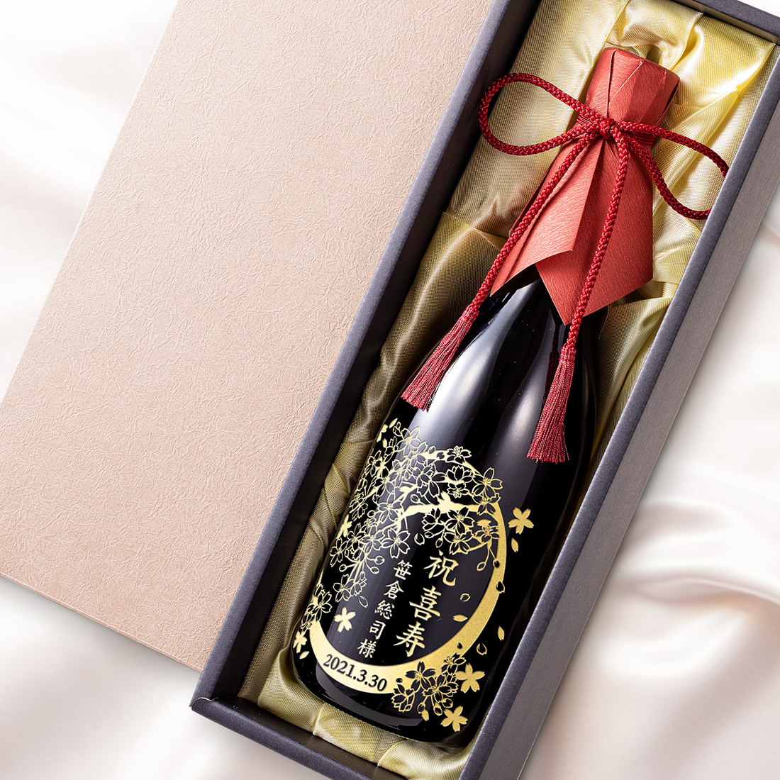 純米吟醸の豊潤な味わいが楽しめる豪華な日本酒です。 また、こちらのビンはオリジナルでラベルを依頼することができ、相手の名前を刻印することが可能! 金の絵柄が高級感を出しており、結婚祝いの贈り物にふさわしい装いです。 デザインも選ぶことができ、世界に1つだけの日本酒を贈れますよ。