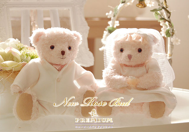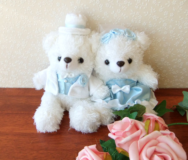 2匹のクマはくっついていて離れることのできない、一心同体のクマです! 永遠の幸せを意味するぬいぐるみは、結婚した二人にピッタリですね。 真っ白なからだに薄いブルーの服がとってもオシャレです。 全体の装飾が可愛らしく、贈ったらきっと喜んでもらえる1品です!