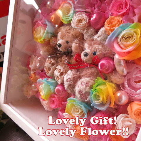壁にかけても置いて飾っても可愛い、ダッフィーのぬいぐるみギフトセットです! ダッフィー&シェリーメイが、花に囲まれて楽しそうですね。 お花のレインボーローズは”願い事が叶う”お花としても知られています。 花言葉は、『奇跡・無限の可能性』です。 夢のある二人にはピッタリの花とぬいぐるみです。 また、プリザーブドフラワーは、造花とは違い、本物のバラなどの生花に特殊加工して、水やりをしなくても長期間、美しく楽しむことができる魔法のお花です。 結婚祝いに最高のプレゼントになりますよ!