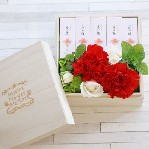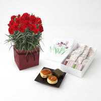 東京都港区虎ノ門にある人気の老舗和菓子店「岡埜栄泉」。 東京のオフィス街の中心にありながら、お持たせや定番のお土産として、ビジネスマンや秘書からも人気のある名店です。 そんな岡埜栄泉の和菓子の詰め合わせに合わせるのはシックな色味のカーネーション。 母の日にぜひおすすめです。