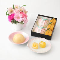 「les fleurs mizuka(レ・フルール ミズカ)」の生花のアレンジとぴったりマッチするのが、「宗家源吉兆庵」の季節の和風ゼリー。 びわの入ったゼリーと、桃のゼリー。 どちらもさわやかでつるんとした食感も心地よく、母の日に喜ばれるかわいらしい贈り物です。