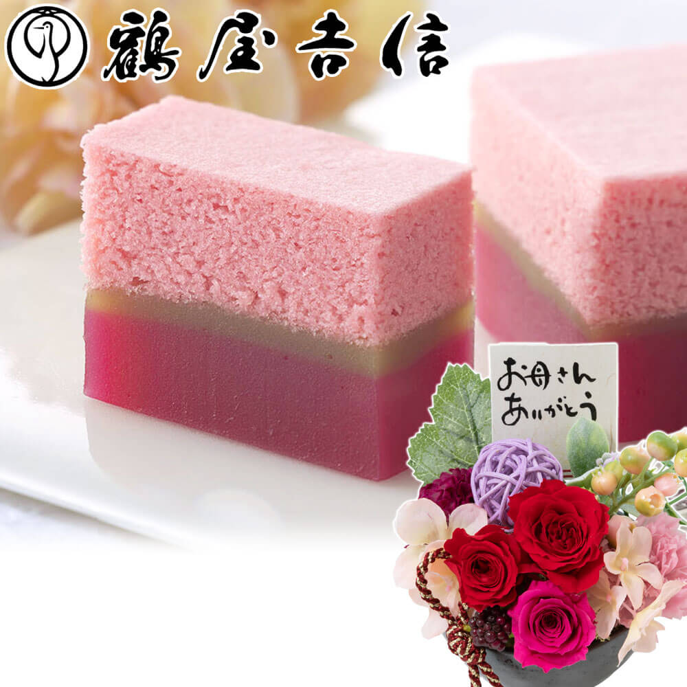 母の日の贈り物らしい色味の美しい和菓子とプリザーブドフラワーのセットです。 この和菓子の名前は「感謝の花」。 たしかにカーネーションのような色味がお母さんへの感謝を表していますよね。 下は羊羹で、上はカステラからなっている和菓子です。