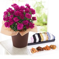 日比谷花壇の濃厚なパープルのカーネーションと、かりんとうのセットです。 色彩の美しさだけではなく、控えめで力強い存在感は、日比谷花壇のセンスを感じます。 麻布かりんとうもかりっとして美味しく、母の日らしい素敵なセットです。