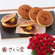 感謝の気持ちを示すメッセージの入った栗入りのどら焼きと、お花のセットです。 笑顔が生まれる極上スイーツをコンセプトにした「さくら堂」。 きめ細かいどら焼きの生地と、しっとりとした餡、一粒はいった大きな栗とのハーモニーを楽しんでください。