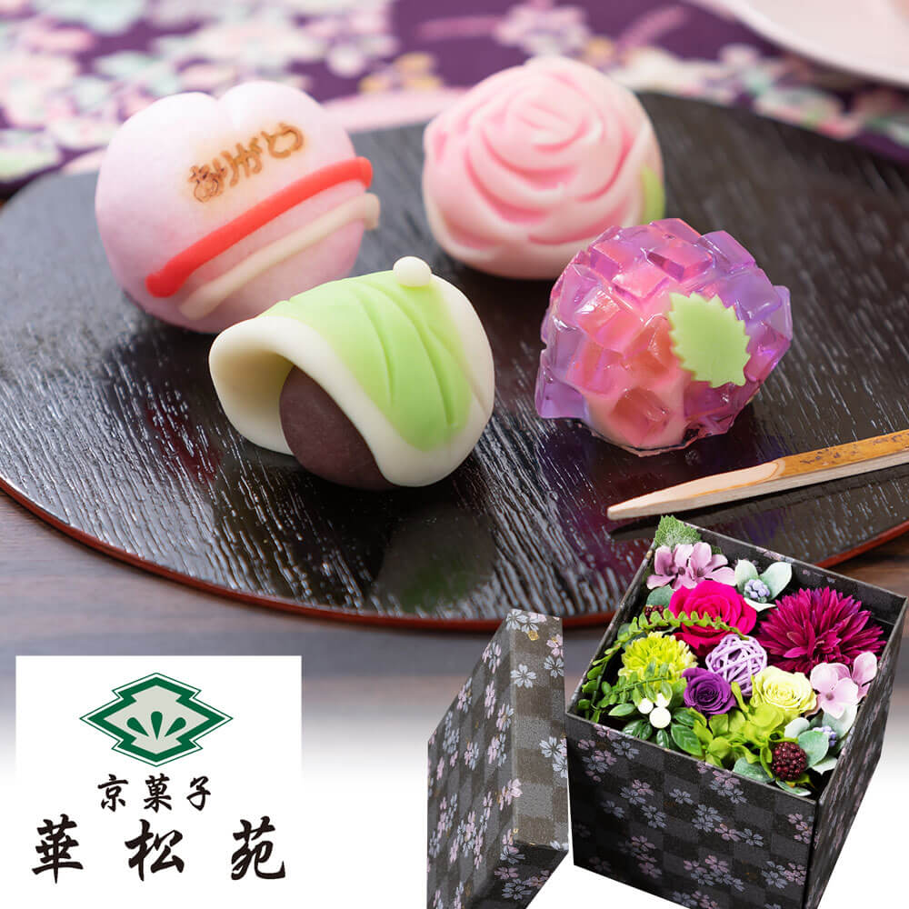 2段の箱の中身は、上段はプリザーブドフラワーで下段は上生菓子です。 京都の老舗和菓子店「華松苑」の和菓子は、見た目も季節感があり彩も美しく、和菓子の良いところが、最大限に表現されています。 母の日に上生菓子というのも趣がある贈り物ですよね。