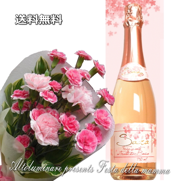 母の日に贈る花はやっぱりカーネーション。 そしてその花に似合ったピンク色のスパークリングワインのセットです。 イタリア語で聖なるという意味をもつSacraは、サクランボの香りがする低めのアルコールで、お酒がちょっと苦手と言うお母様でも楽しむ事が出来ます。 爽やかでやさしい桜色のスパークリングワインです。
