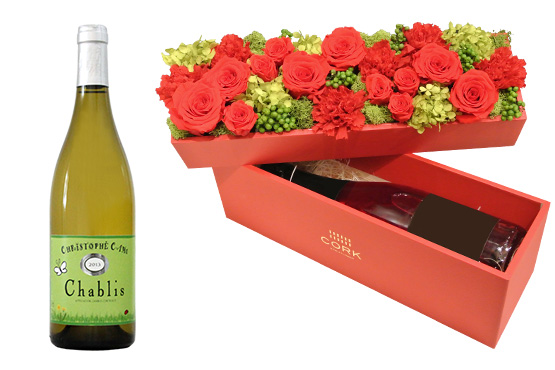 蓋に飾られたブリザードフラワー、花の美しさを永遠に閉じ込めたものです。 蓋をそのまま棚や写真縦の様に飾る事が出来ます。 フランスの伝統的な製法で作られた白ワイン、シャブリは化学肥料を一切使っていないオーガニックなワインです。 酸味と果実の甘みがエレガントな味を提供しています。 花とワインの組み合わせ、親子で楽しんでください。