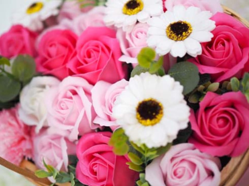 バスケットに本物そっくりなお花がたっぷり詰め込まれている様子は、フラワーアレンジメントかと思いますよね。 飾って楽しんで、香りを楽しんで、花びらをお風呂に浮かべて入浴剤として楽しんでと、お得感いっぱいの母の日のプレゼントですね。