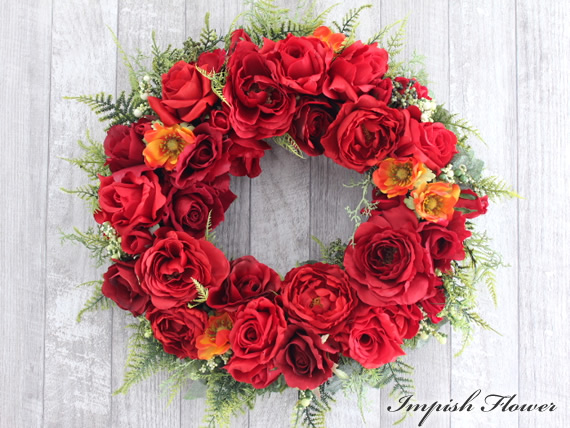 真っ赤なローズがとてもインパクトのある、赤色が大好きなお母さんへおすすめのリース型造花アレンジメントです。 壁に掛けられるので設置スペースも取らず、見た目もとっても豪華♪ リビングや玄関におすすめです♡