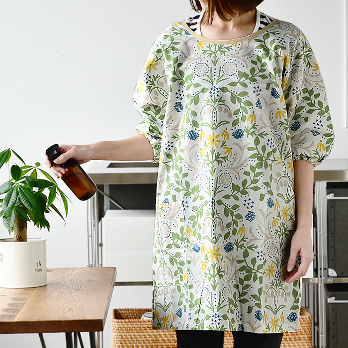 北欧柄の明るい雰囲気の割烹着です。 邪魔になりにくい七分丈で、着心地もばっちり!着ているだけで、気分が明るくなって家事もはかどりそう。キッチンが明るくなる華やかなエプロンです。