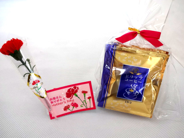 お母さんありがとうカーネイションと母の日カード付の付いた、じざけやスペシャルオリジナルブレンドドリップパック5個入り! 煎りたての香ばしい味と香りがあり、適度に苦味の利いた傑作品です。 いつも言えない「感謝」を、コーヒーとお花で伝えましょう!