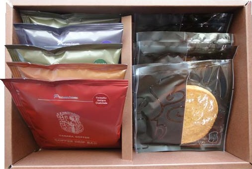 やなか珈琲自慢の深いコクと豊かな香りを楽しめる5種類のドリップコーヒーと、5種類の大型クッキーの詰め合わせです。 コーヒーの香りに負けないクッキーの風味は、発酵バターを使用したもの。 7㎝という大判のクッキーはやなか珈琲の濃厚なコーヒーの味にぴったりです。 お母さんが楽しみになるコーヒータイムになりそうですね。