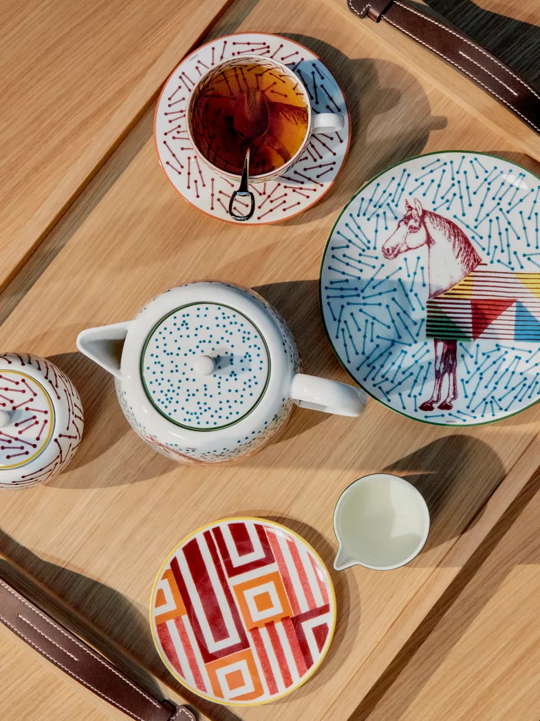 陽気で遊び心にあふれたエルメスのテーブルウェア。 「ジャンパオロ・パニ」は、ジョッキー服のようなグラフィカルなギリシャ装飾風パターンの馬着をまとった馬をモチーフとしています。その他、それぞれの図柄がテーブルウェアの中でモチーフが美しくちりばめられ、巧みに組み合わされている「イポモビル」など。 ハイブランドの遊び心あふれるテーブルウェアは、さまざまなシーンを彩ってくれます。 特別な方へのお祝いのプレゼントに最適です。