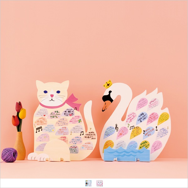 猫や白鳥が可愛いアニマル色紙です! 動物好き、可愛いもの好きな新郎新婦へのプレゼントにぴったりです。 メッセージを書く用のシールがついていて、柄に合わせてシールを貼るだけの簡単な色紙です。 スタンドが付属しているので、立てて飾ることができますよ!