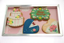 〝Happy Wedding〟の文字が入ったプレートに、 ウェディングケーキ・新郎新婦の衣装をモチーフにしたアイシングクッキーのセット。 まさしく、結婚祝いのプレゼントにぴったりの逸品です♡ お値段は、税込1,620円にてお求めいただけます。 デザインは、時期によって多少変更になる場合がありますので、予めご了承ください。