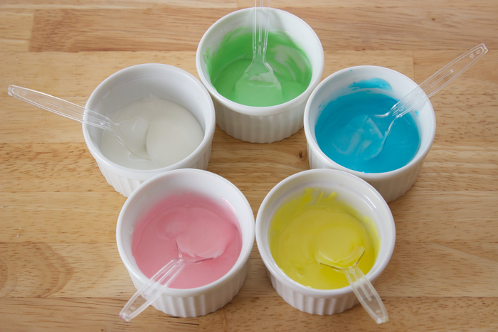 では、いよいよ…… ③アイシングクッキーを作っていきます。 1、材料を混ぜてメレンゲを作ります。角がたつまで、しっかり泡立てることがポイントです♪ 2、メレンゲにアイシングカラーを足して必要な色を作っていきます。 色ごとに小皿に取り分け、少しずつ加えていくといいですね。 3、アイシングを「搾り出しやすくかつ崩れない」固さに調整します。 水を少しずつ加えていき、「歯磨き粉よりほんの少し柔らかめ」になったらベストです。 4、コルネにアイシングをつめ、デザインに沿って絵柄や文字を入れていきます。 すると、あっという間に素敵な手作りアイシングクッキーの出来上がりです♪