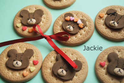 作り方が分かれば、あとはレシピを決めるだけ! 初心者さんにも簡単で、人気のデザインをご紹介します。 こちらは、お馴染みのマリービスケットに、くまのジャッキーをデザインしたアイシングクッキーです。 作り方は、下にあるリンクよりご覧いただけます。