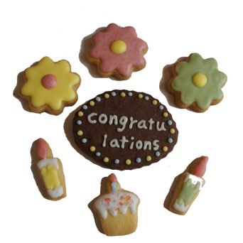 このお店で、特におすすめなのが、こちらのアイシングクッキー。 お祝いメッセージ入りのプレートに、 3色のお花・カップケーキ・ローソク2本をモチーフにしたクッキーをセットにしました! クリアBOXに入れて、大切にお届けいたします。 お値段は、1,000円にてお求めいただけます。 ご友人や職場の同僚など、ちょっとしたお祝いを贈りたいという場合に、ぴったりのプレゼントです♪