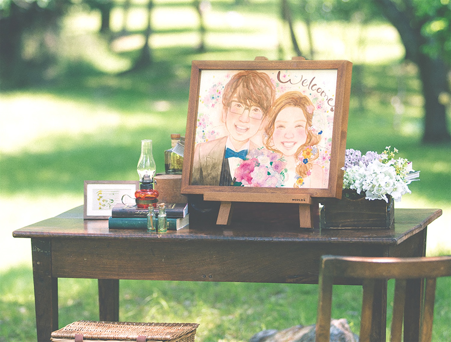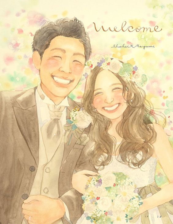 新郎・新婦の似顔絵と、二人の名前を使って心温まるメッセージを加えました。 笑顔が彩る素敵なウェルカムボードで、二人の幸せをゲストの方にお裾分けします。 この世に二つとない、温かさを感じる作品です!