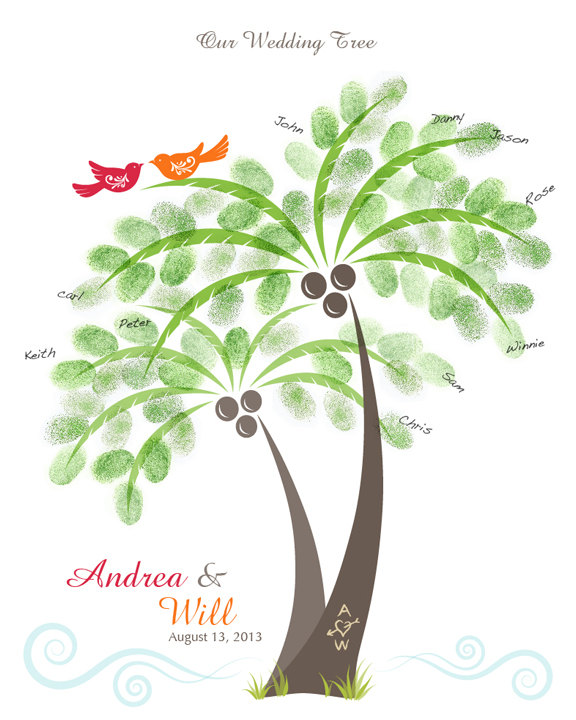 これは『ウェディングツリー』といウェルカムボードです。 日本でも最近はお馴染みになってきましたが、木が描かれたキャンバスにゲストの方々に結婚の祝福と承認の気持ちを込めて指でスタンプをしてもらいます。 その指の指紋のスタンプ1つ1つが葉となり、初めてボードが完成するというものです。