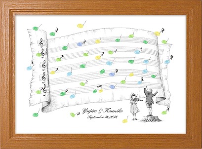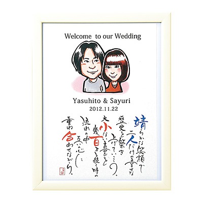 こちらは、二人の似顔絵ウェルカムボードにしたものです! 最近は、似顔絵のウェルカムボードがちょとした流行りにもなっており、写真はいやだけど似顔絵ならいいと考える方もいるようです。 人気の画家の方もいるようで、作風も画家の方によって様々です! 注文を受ける会社も多いので、気にいった画風で選ぶのも良いでしょう。 この絵は『WORLD1』に所属する『フジエシュンスケ』さんが書いたものでしょうか! 人気の画家の場合は価格が高いのが普通で、こちらはMサイズ『318×410×20mm』で、絵が38,000円『税別』になります。 他に額が8,000円、イーゼルが実用であれば3,200円がかかります。 全てがMサイズなので、サイズが変われば価格も変動します。 また、画家の方によっても価格が違い、書く人数によっても金額がかわります。 今回は、結婚される2人だけですので、この価格になっており、家族やペットも加えると価格は変わっていくので、確認して下さい。 また似顔絵のウェルカムボードに『参加者で作る要素』を加えたものもあります。 背景に木があり、花や葉を参加者の『指紋』で付けていきます。 全員の参加者が指紋で花をつけてくれれば、木は満開になるという素敵なボードです! 結婚祝いにはもってこいですね!