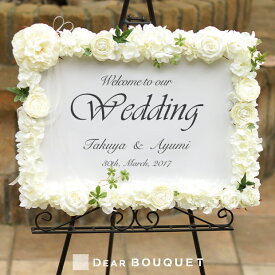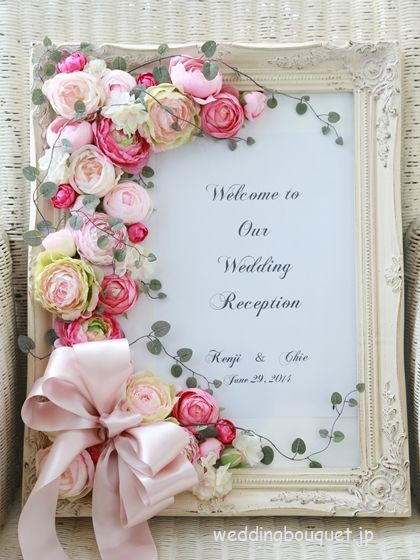 特別な製法で作った『プリザーブドフラワー』を使ったウェルカムボードです! 造花ではない、生の花にかなり近い感じがとても美しく、みずみずしさを感じさせます。 プリザーブドフラワーとポイントの大きなリボンを飾るだけで、とても可愛らしくボード全体の雰囲気も大きく変わります。 プリザーブドフラワーは長持ちしますので、使用後も自宅で楽しめるので、お二人の素晴らしい結婚祝いになりますね!