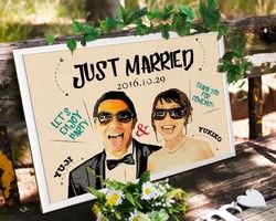 結婚式はお祝いですので、楽しんで頂きたいという気持ちと二人の個性があらわれています。 写真とイラストが上手くハマって、とても面白い仕上がりになっています。 仕上がりが良い割には、お金がかかっていないようなので、お勧めのウェルカムボードです。 但し、二人の息のあった絶妙なセンスが必要ですね!